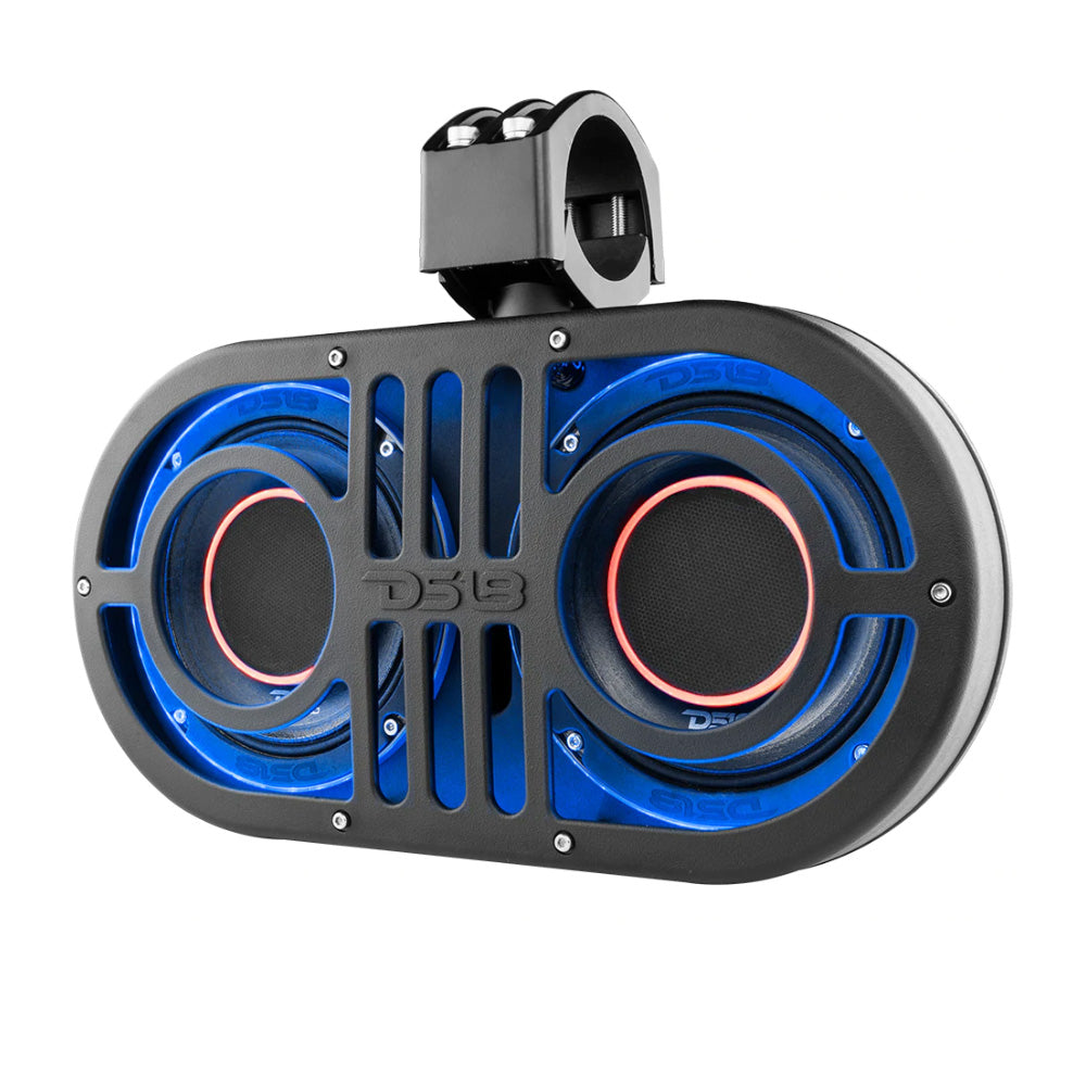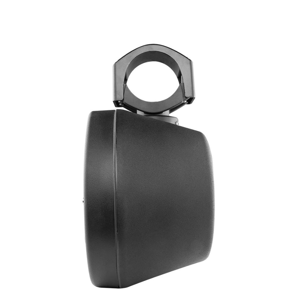 The exclusive enclosure is a fantastic piece of equipment. It is made of extremely durable mold-injected plastic and is sure to outlast your boat/vehicle and can easily be transferred to the next. There is a very strong plastic grill that protects the speakers and also RGB LEDs are strung around the inside so you can match your vehicle's color or lighting theme.